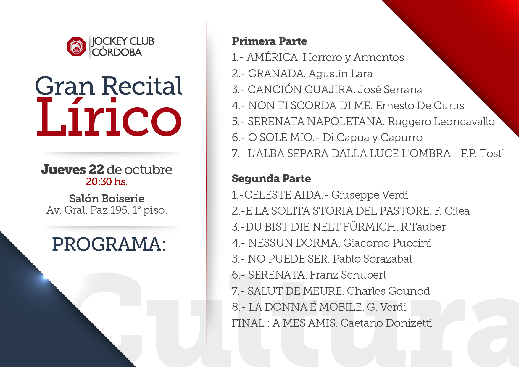 Continuando con la actividad cultural del año, la Subcomisión de Cultura del JCC presentará el día jueves 22 de octubre a la hora 20:30 hs un gran «RECITAL LÍRICO» en el Salón Boiserie de la sede de la Institución (Av. Gral. Paz 195, 1° piso), con la participación del prestigioso tenor cordobés Dr. Delfín López acompañado al piano por el conocido Maestro Gerardo Casalino.