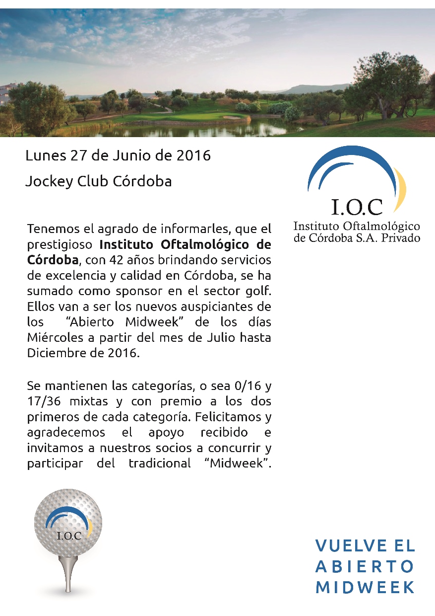 Tenemos el agrado de informarles que el prestigioso Instituto Oftalmológico Córdoba, con 42 años brindando servicios de excelencia y calidad en Córdoba, se ha sumado como sponsor en el sector golf. Ellos van a ser los nuevos auspiciantes de los «Abierto Midweek» de los días Miércoles a partir del mes de Julio hasta Diciembre del 2016.