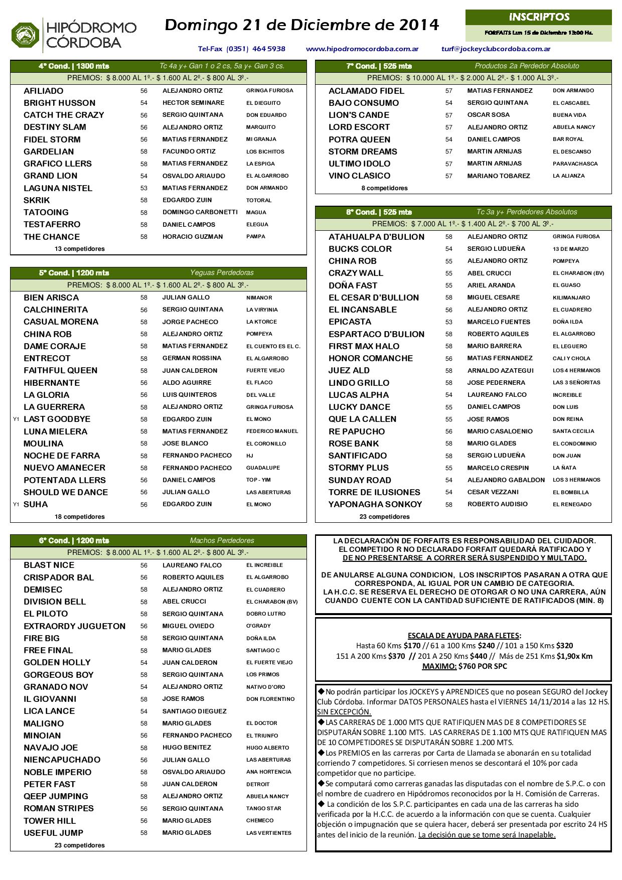El próximo domingo 21 de diciembre (se trasladó del 14 al 21 de diciembre), llega la última reunión del año del Hipódromo Córdoba, la N° 11 correspondiente a los clásicos Clausura (2000 mts.), Verano (1200 mts.), Gdor. Provincia de Córdoba (1200 mts.) e Intendente Municipalidad de Córdoba (1200 mts.). A continuación, los INSCRIPTOS: