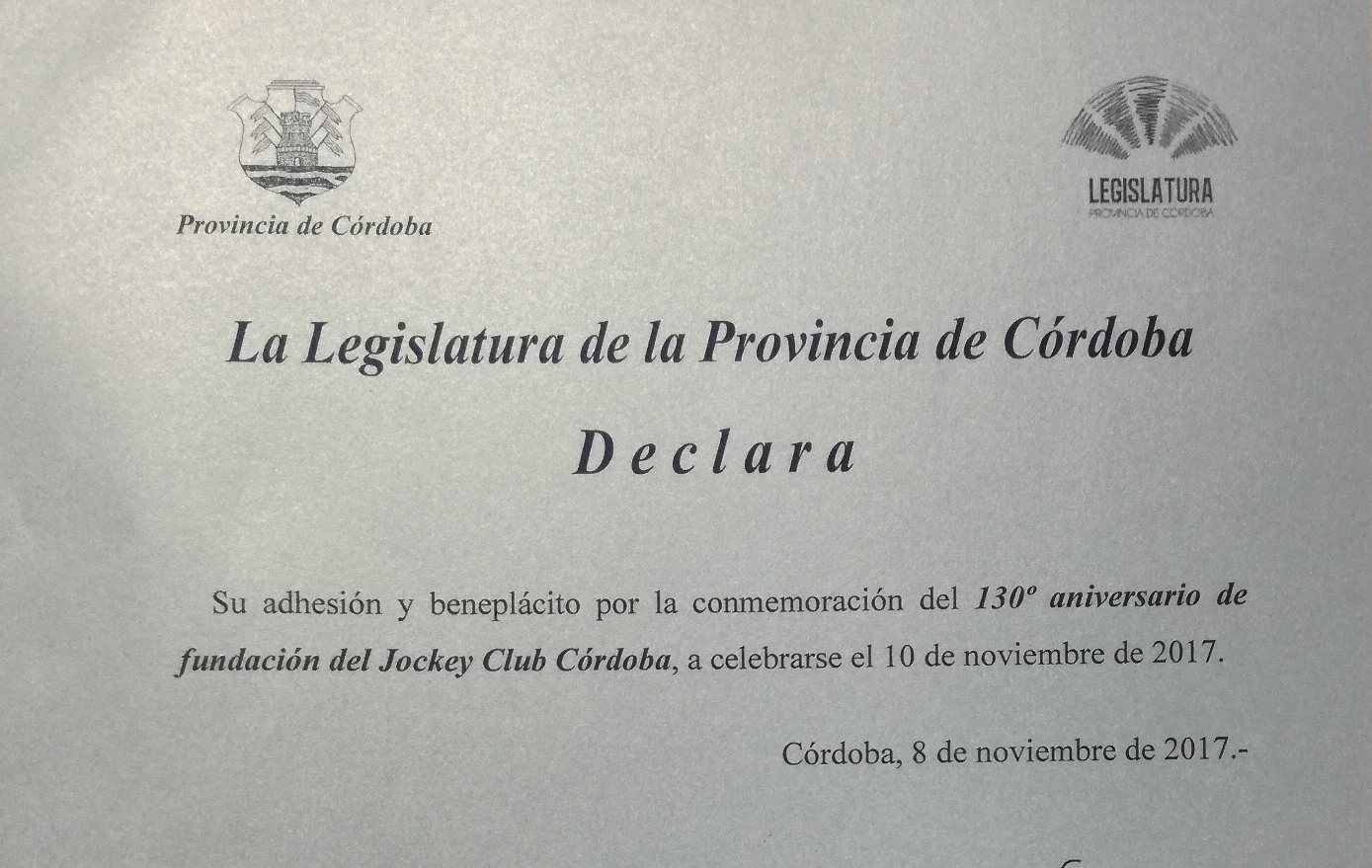 El Jockey Club Córdoba agradece a la Legislatura de la Provincia de Córdoba por su adhesión y beneplácito por la conmemoración del 130º aniversario de la fundacion de nuestra institución.