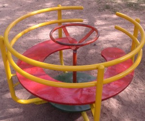 Calesita: funcionaba con un juego axial en su eje. Se desarmó íntegramente. Actualmente está en taller ya que se reemplazarán sus 2 (dos) rulemanes y construyo su base con protección rodamiento ante las lluvias..